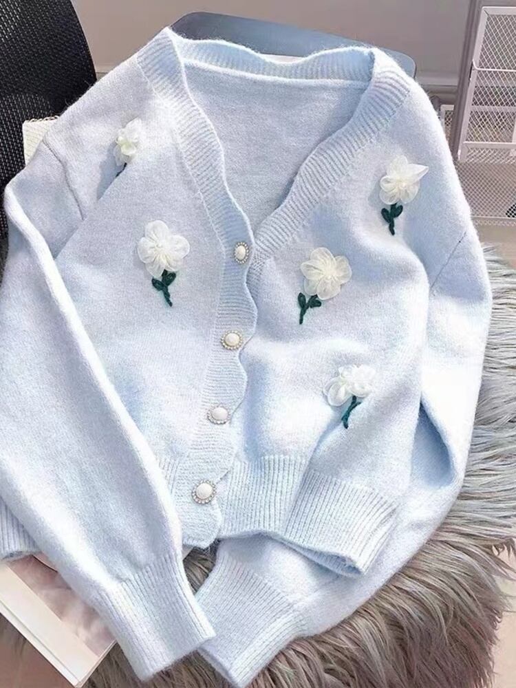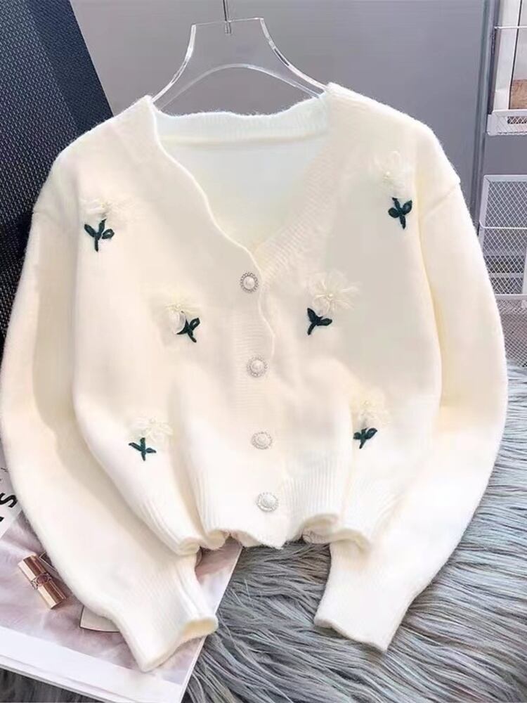 [EWQ] 美しい花 V ネック シングルブレスト ニット カーディガン セーター レディース ニット トップス 2024 春秋 16U8291 スプリング 春物 オータム 秋物 Vネック フラワーデザイン