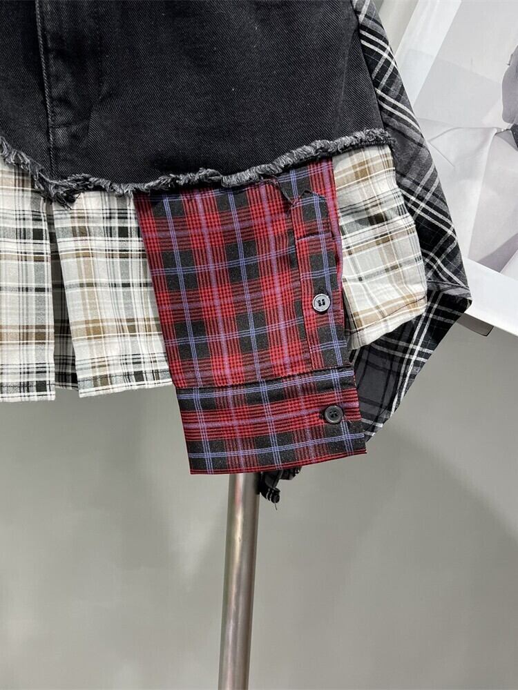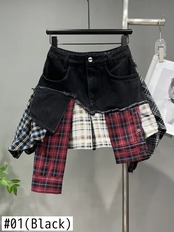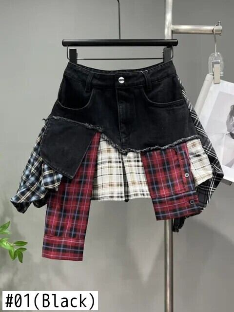 [EWQ] エイブル ブラック イレギュラー パッチワーク チェック柄 スカート デニム ショート丈 レディース ミニスカート 2024春夏 16U9004 スプリング 春物 サマー 夏物