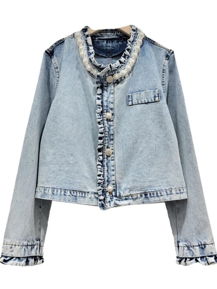 [EWQ] 多用途ビーズスタンドアップカラーレースショートジャケットダイヤモンドシングルブレストデニムコートレディース 2024 春夏 16U8792 スプリング 春物 サマー 夏物