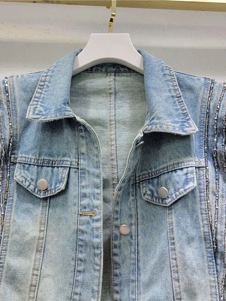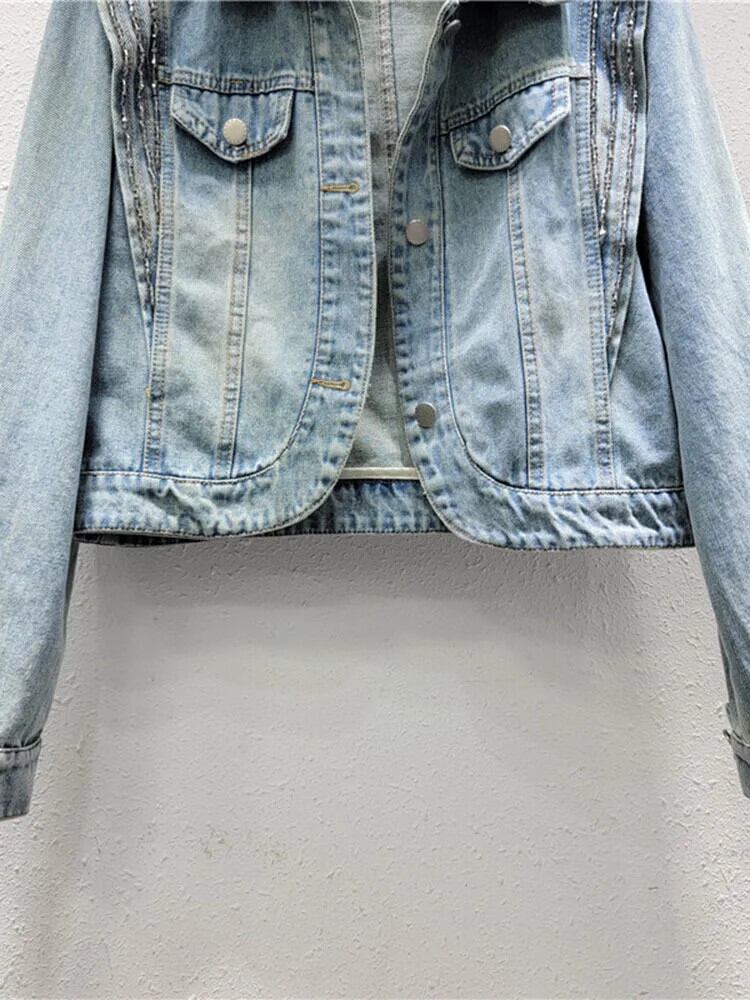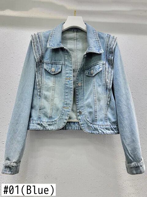 [EWQ] ヨーロッパ レディース デニム ジャケット ビーズ 長袖 フィットラペル シングルブレスト コート 2024 春夏 16U8790 ロング スプリング 春物 サマー 夏物 ヨーロピアン