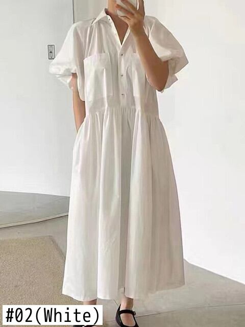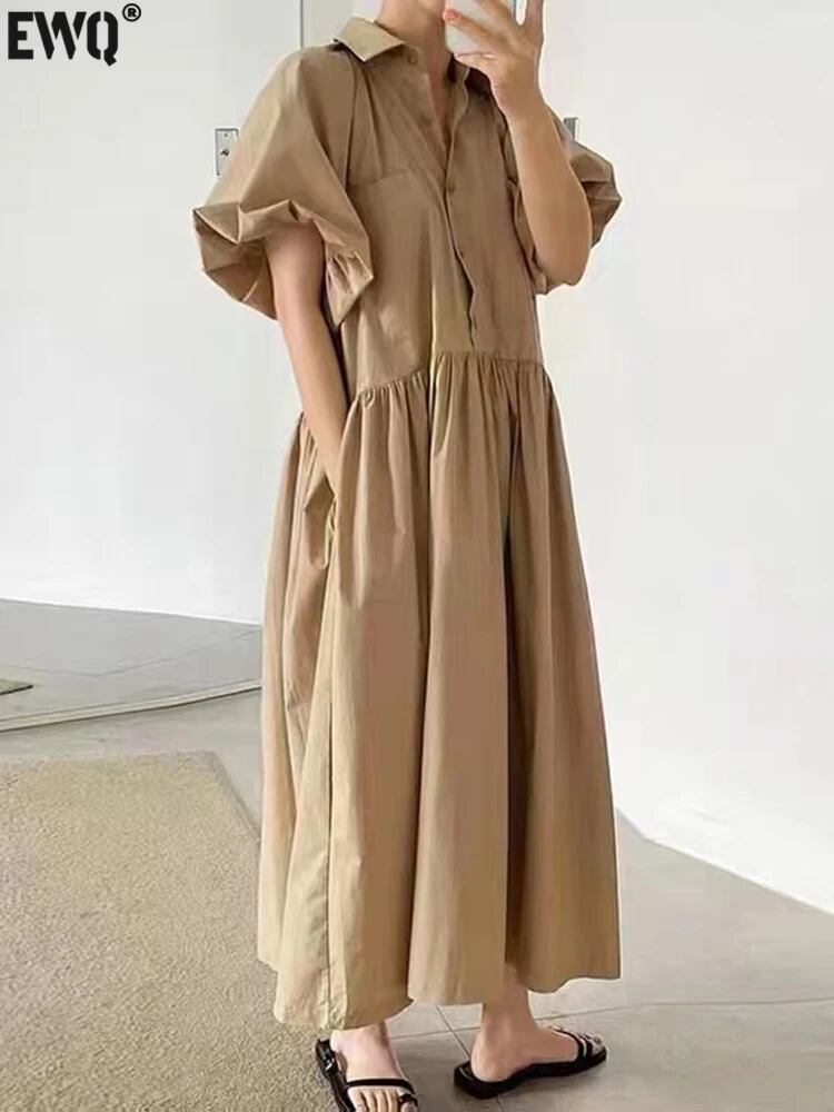 [EWQ] シックミニマリストラペル大きポケットランタンスリーブ大き裾ロングドレスレディース 2024 春夏 16U8909 スプリング 春物 サマー 夏物