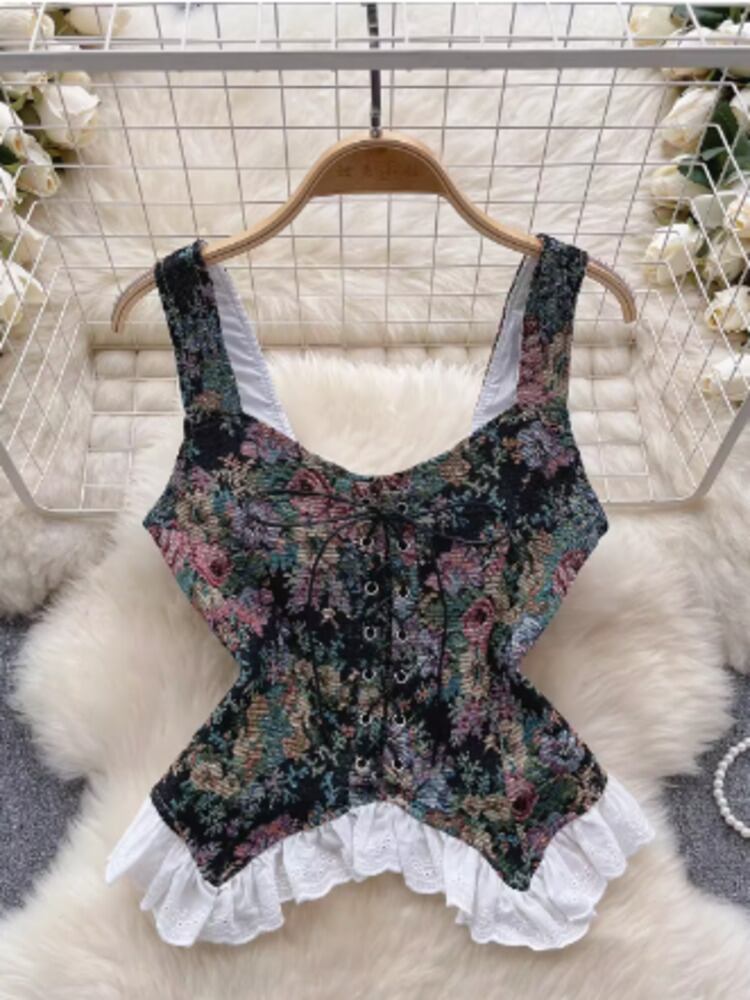 [EWQ] ジャガード キャミソール ベスト レディース 甘いレース パッチワーク ショート ノースリーブ きれいめ タンクトップ 2024 春夏 16U9007 半袖 ハーフスリーブ 大人ガーリー スウィート キュート カジュアル スプリング 春物 サマー 夏物