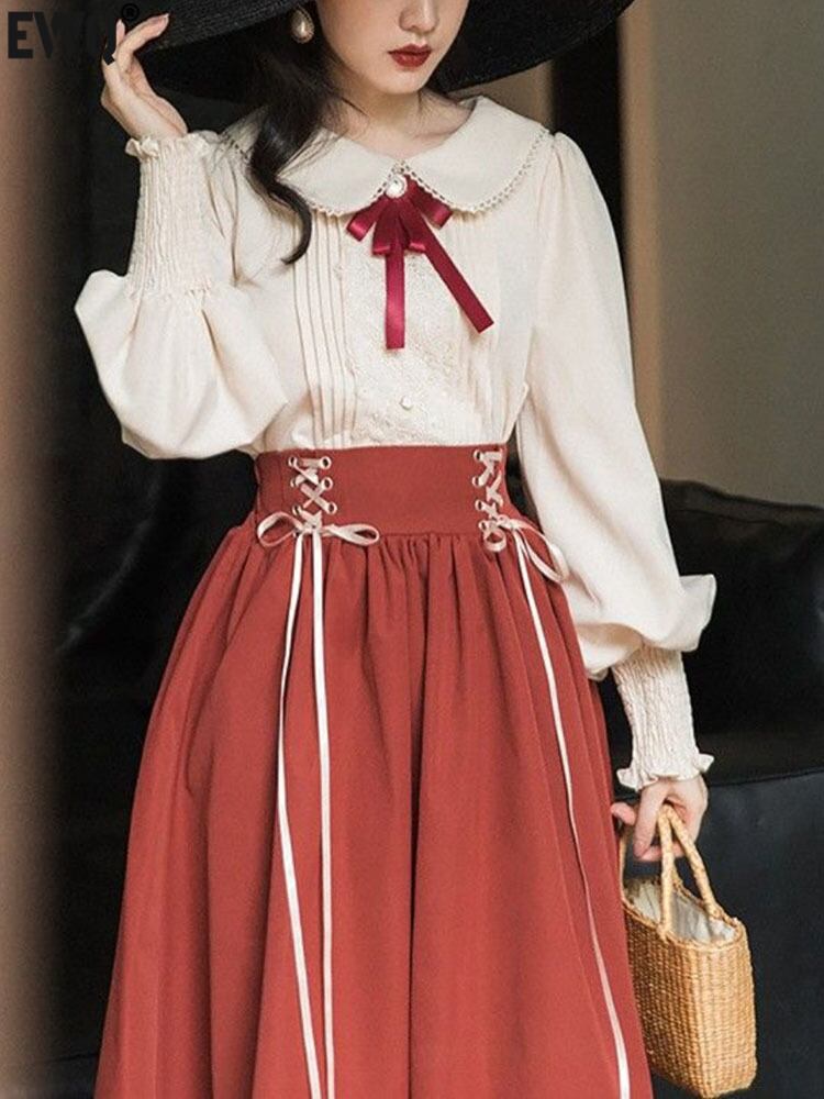 [EWQ] ドールカラー長袖プリーツシャツ レースアップ 無地 スカート 2点セット レディース 2024春夏 16U9018 ロング スプリング 春物 サマー 夏物 ソリッドカラー