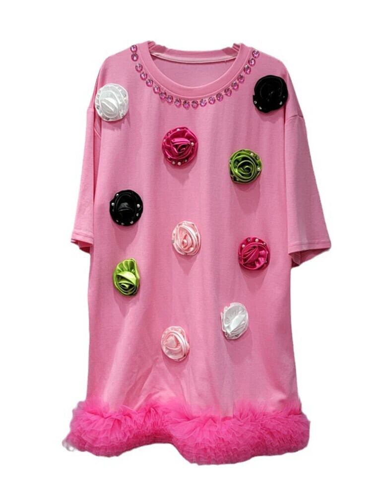 [EWQ] 美しいメッシュ パッチワーク 半袖 Tシャツ 3D フラワー装飾 ルーズ トップ レディース 2024 春夏 16U9037 ショート ハーフスリーブ スプリング 春物 サマー 夏物 フラワーデザイン