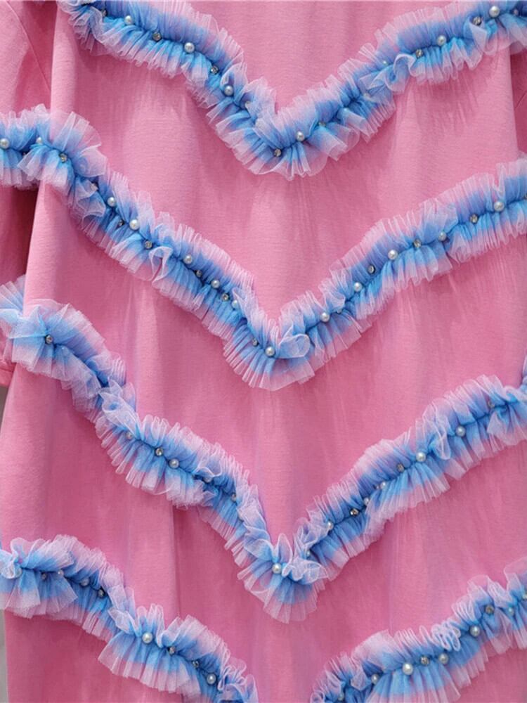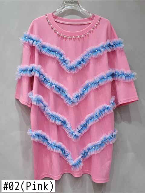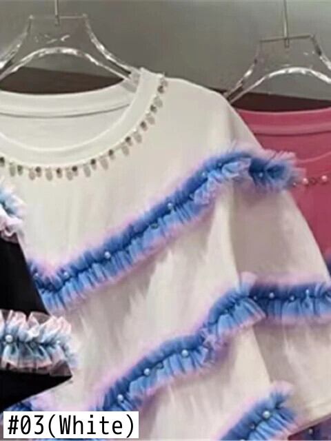 [EWQ] きれいめOネック半袖ロングTシャツ ネイルダイヤモンドビーズメッシュ耳ルーズトップ 2024春夏 16U9038 ショート ハーフスリーブ スプリング 春物 サマー 夏物
