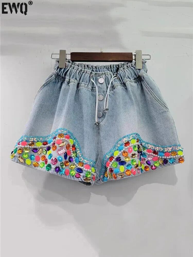 [EWQ] 美しいカラフルダイヤモンド ビーズ ウエスト ルーズ ワイドレッグ デニム ショートパンツ 巾着 弾性パンツ 2024 春夏 16U9021 エラスティック 伸縮 スプリング 春物 サマー 夏物 ショーツ ブルマー ワイドパンツ
