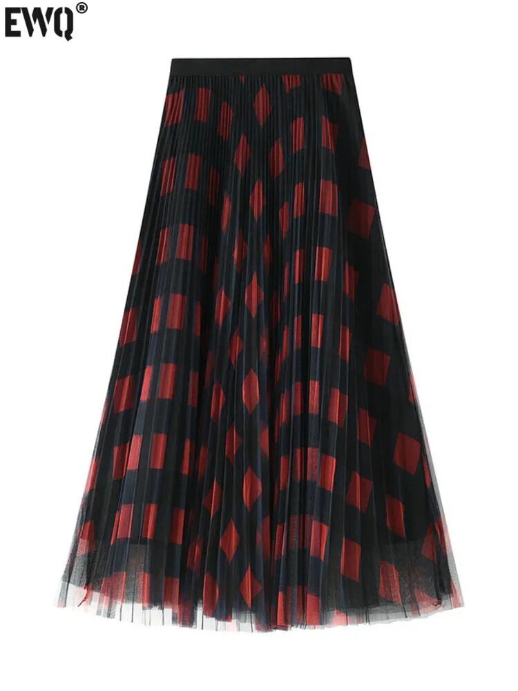 [EWQ] 気質アップ カラフルチェック柄メッシュプリーツスカート ミディアム丈 レディース ボトムス 2024春夏 16U8662 スプリング 春物 サマー 夏物