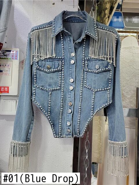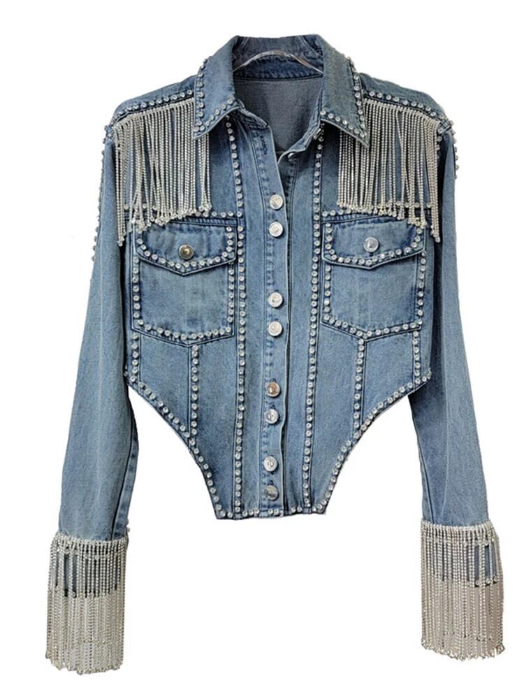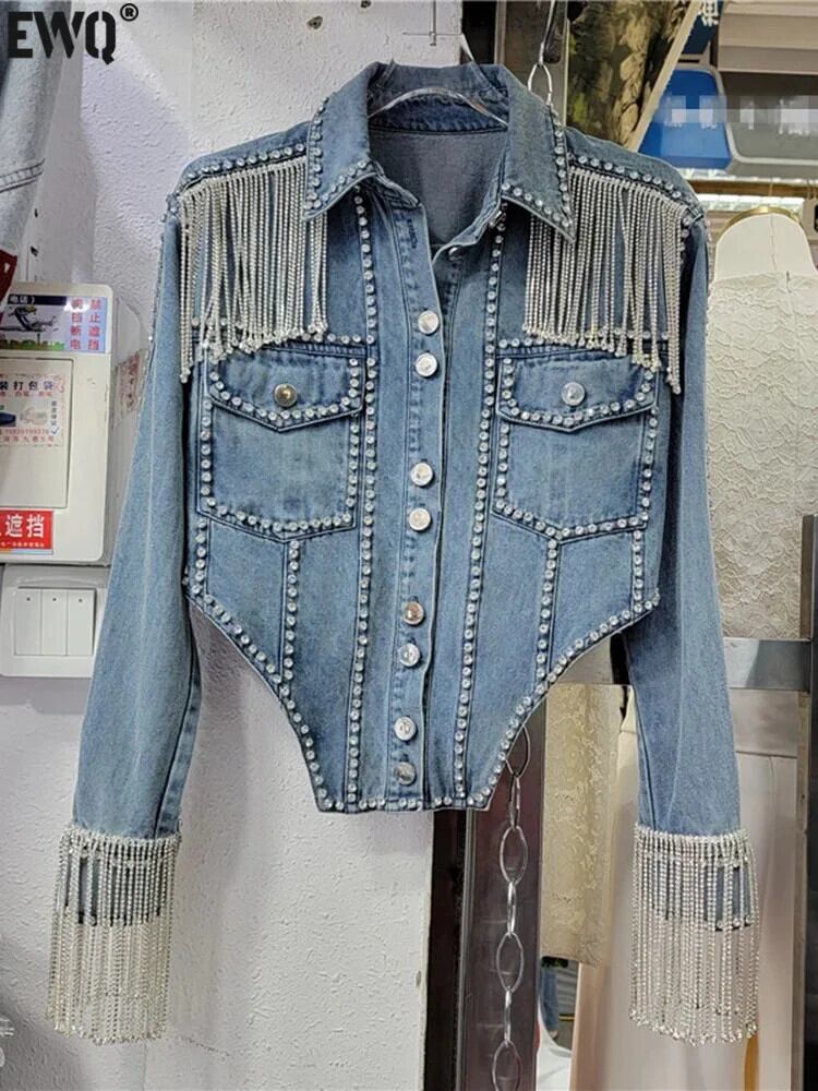 [EWQ] ラグジュアリーチェーンテル ダイヤモンド デニムジャケット レディース ラペル シングルブレスト コート 2024春 16U8834 スプリング 春物