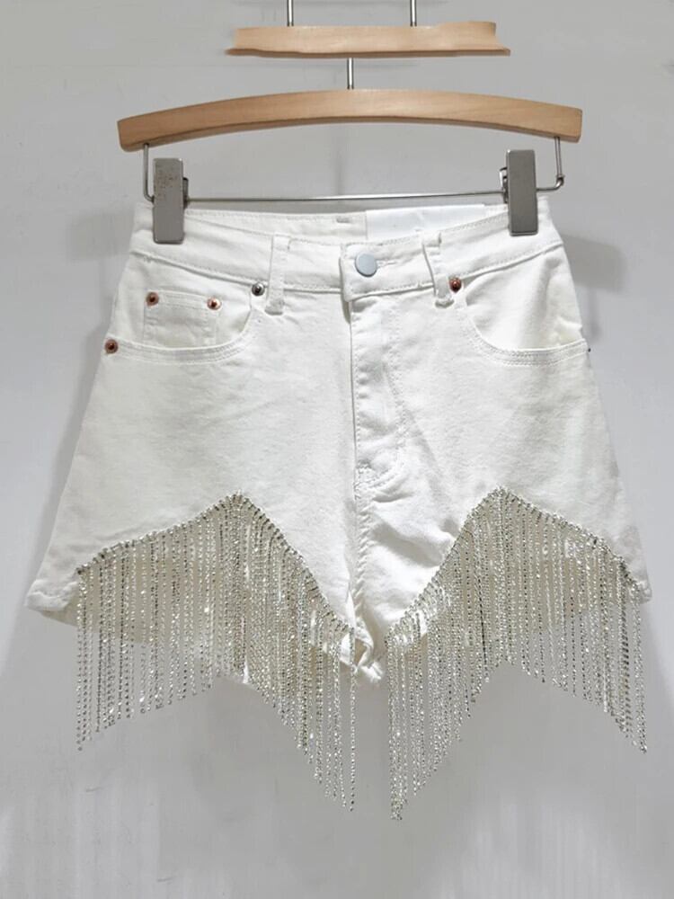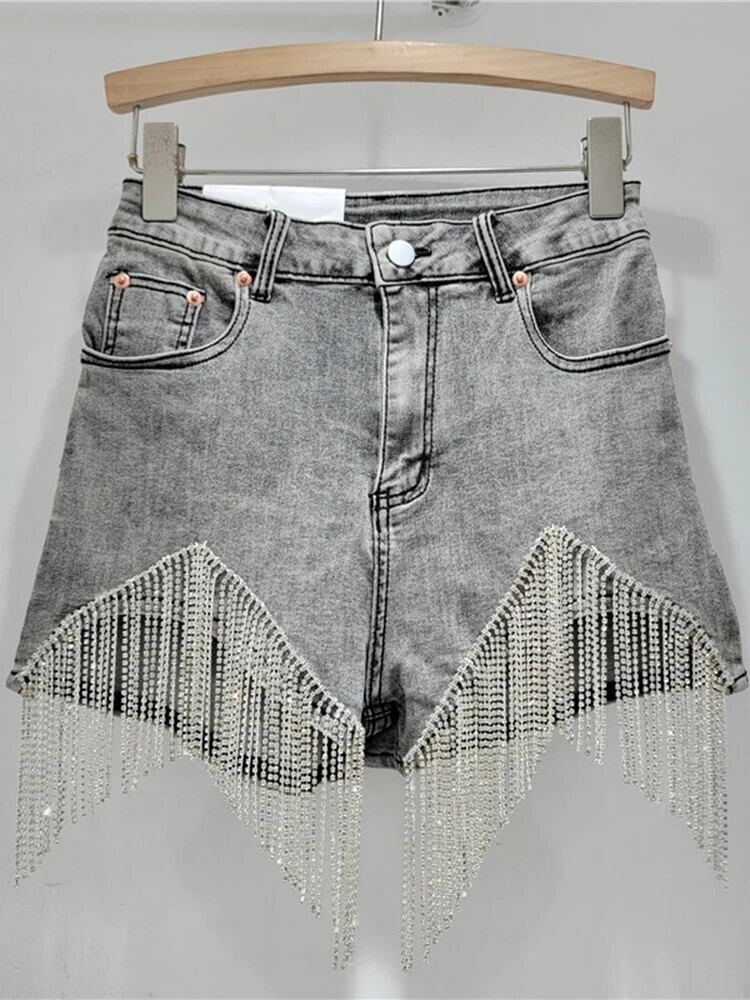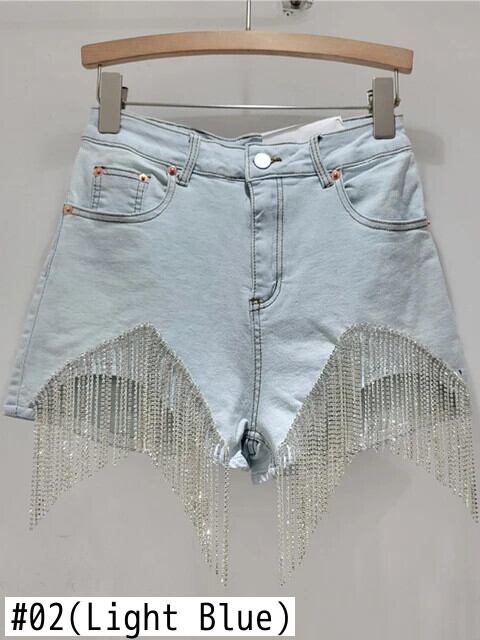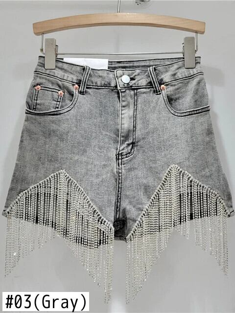 [EWQ] 高級テルチェーンダイヤモンドデニムショーツウエストネイルビーズ無地ショートパンツ 2024 春夏 16U9040 スプリング 春物 サマー 夏物 ブルマー ソリッドカラー