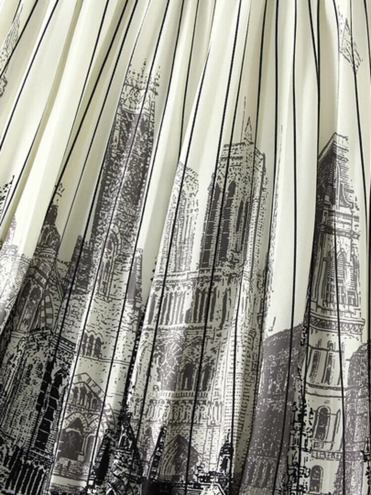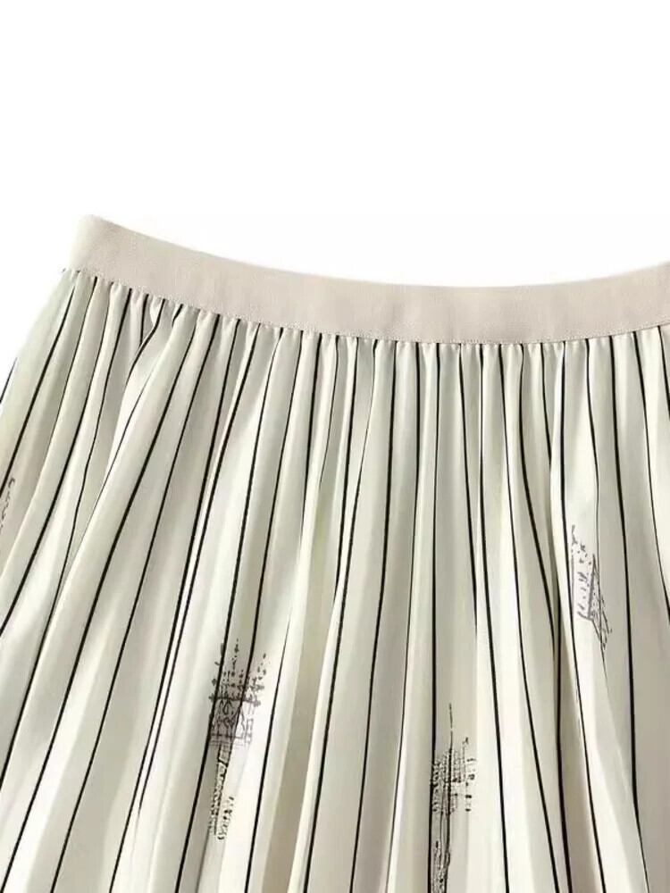 [EWQ] ストライプ プリント 幾何学 レディース ウエストゴム 大きい裾 プリーツ ハーフスカート 2024 春夏 16U8656 エラスティック 伸縮 スプリング 春物 サマー 夏物