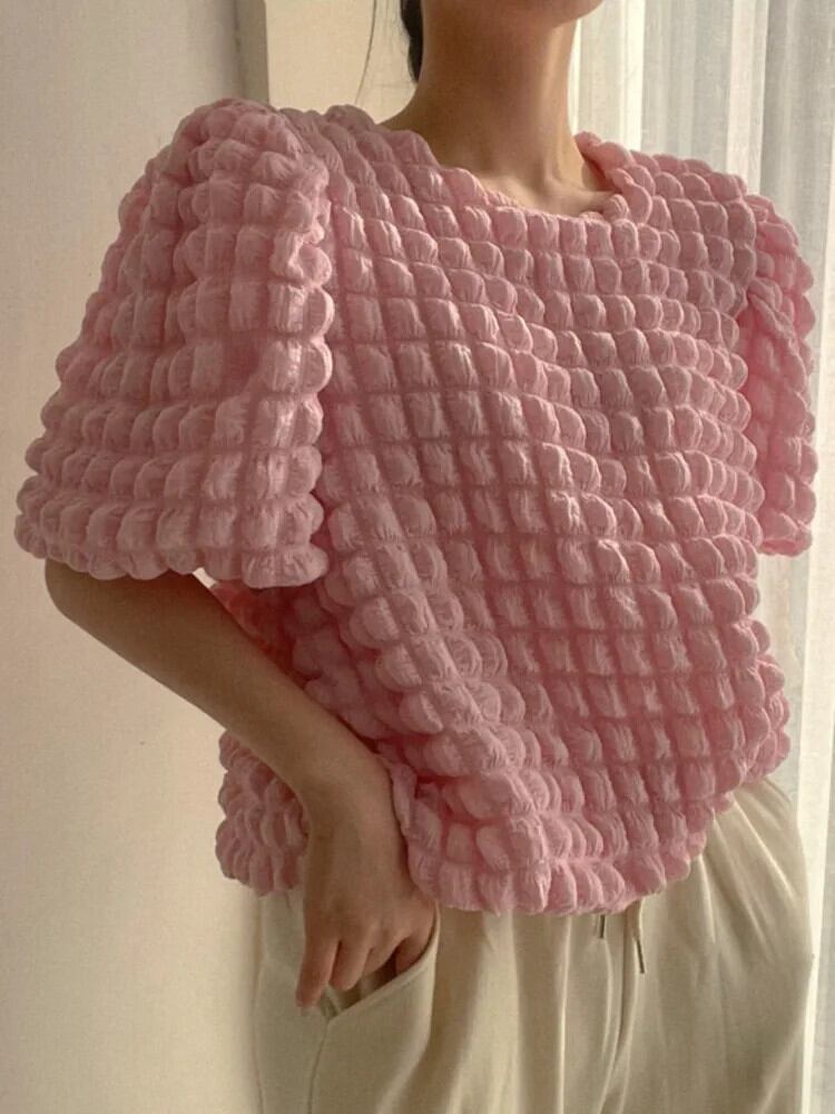 [EWQ] シック スイート ピンク パープル イエロー バブルスリーブ トップス 裏地付き レディース Oネック ルーズ Tシャツ 2024春夏 16U8960 大人ガーリー スウィート キュート カジュアル スプリング 春物 サマー 夏物