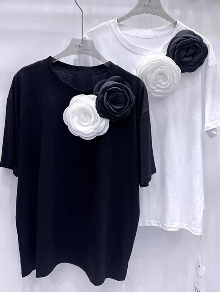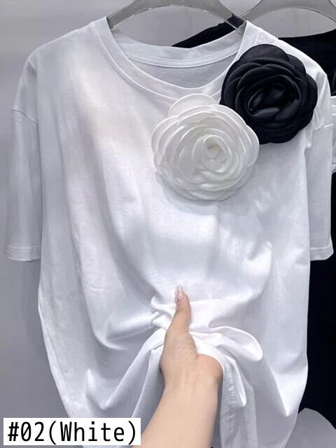 [EWQ] 立体フラワー Oネック 半袖 トップス ルーズ Tシャツ レディース 2024春夏 16U9074 ショート ハーフスリーブ スプリング 春物 サマー 夏物 フラワーデザイン