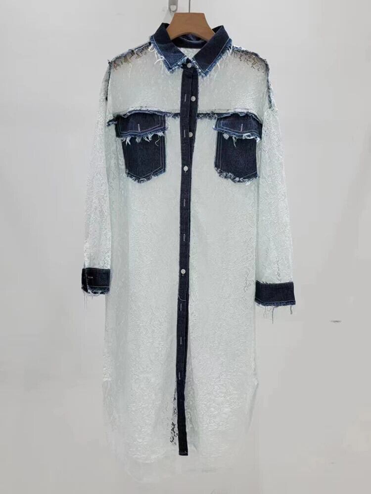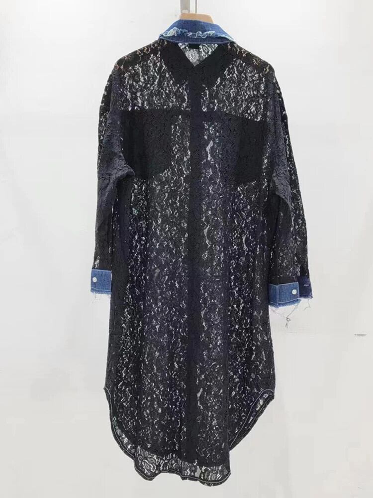 [EWQ] ラペルデニム パッチワーク ロングシャツ ブラック ホワイト ポケット レース ブラウス レディース トップス 2024春夏 16U9045 スプリング 春物 サマー 夏物