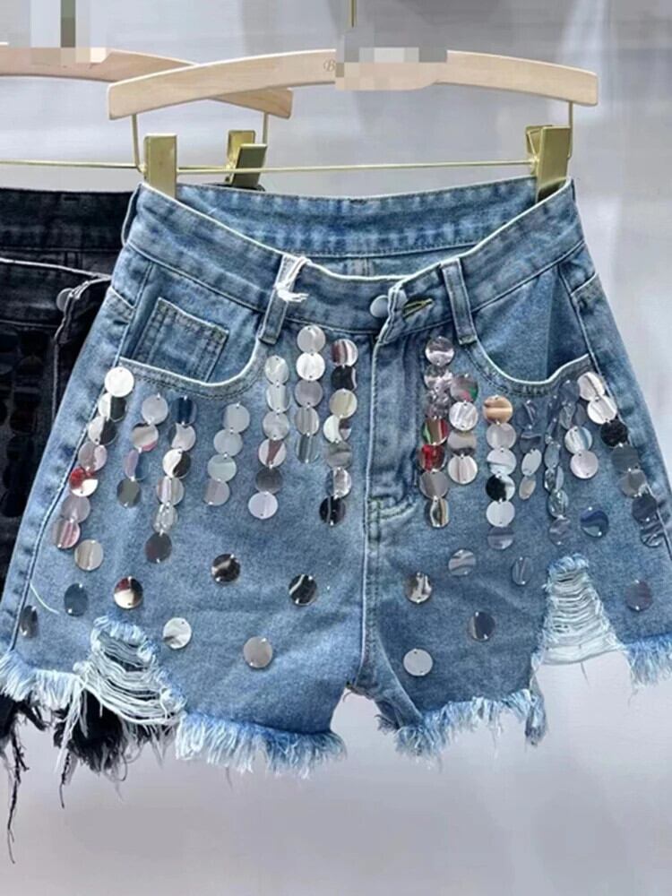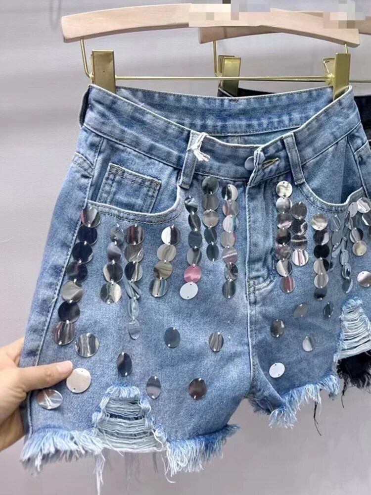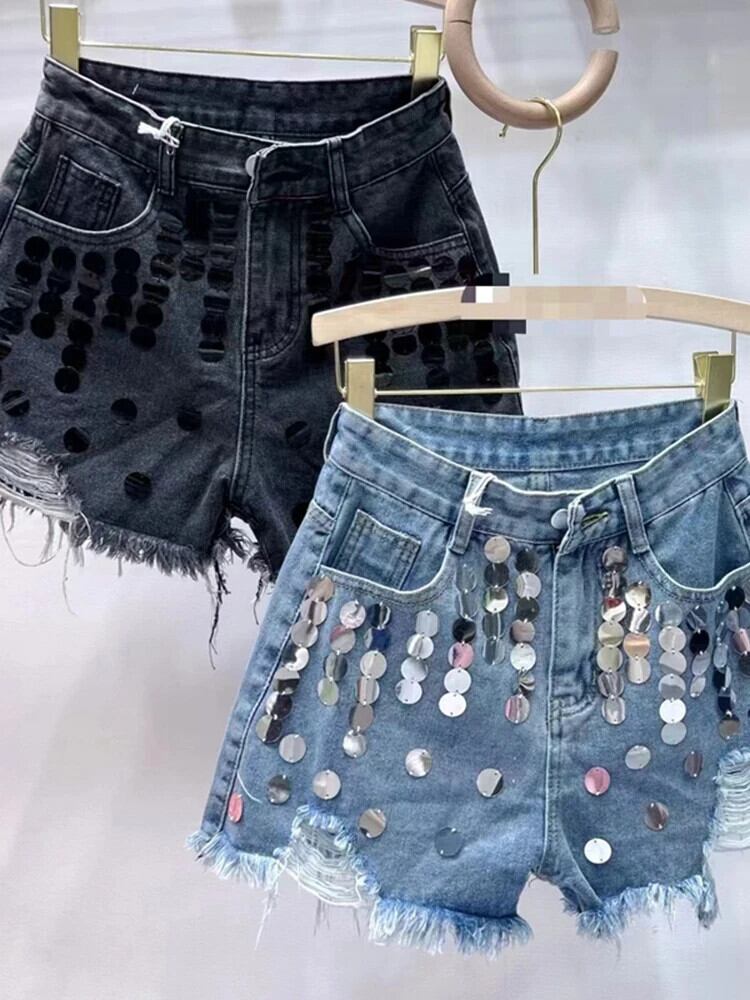 [EWQ] ヨーロピアンウエスト Aライン ワイドレッグショーツ レディース スパンコール テルホール デニムパンツ 2024春夏 16U9082 スプリング 春物 サマー 夏物 ブルマー ワイドパンツ