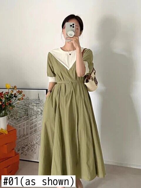 [EWQ] ワンピース パッチワーク カラーコントラスト タイアップウエスト スリム バブルスリーブ ロングワンピース 2024春夏 U9101 スプリング 春物 サマー 夏物 ドレス