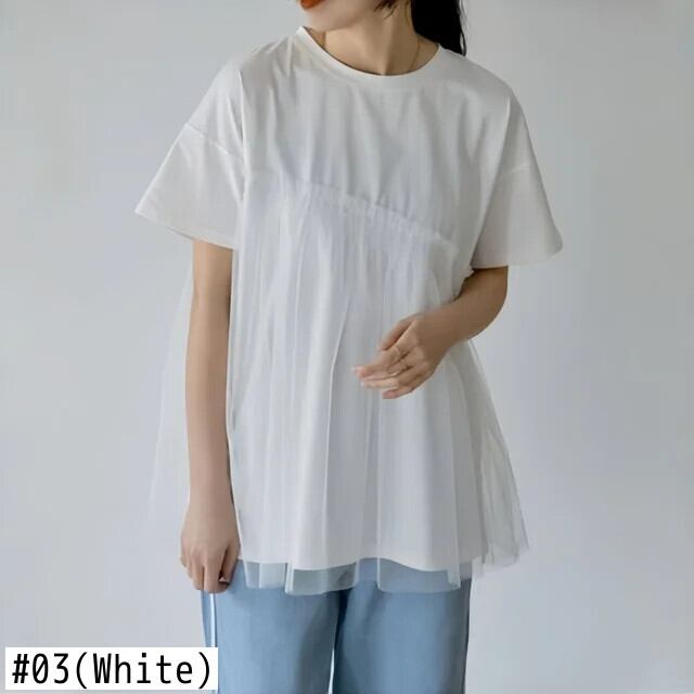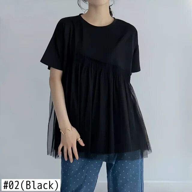 [EWQ] シンプル ブラック ホワイト メッシュ スプライス 半袖 ラウンドネック プルオーバー Tシャツ トップス 2024春夏 16U8948 ショート ハーフスリーブ スプリング 春物 サマー 夏物 Oネック