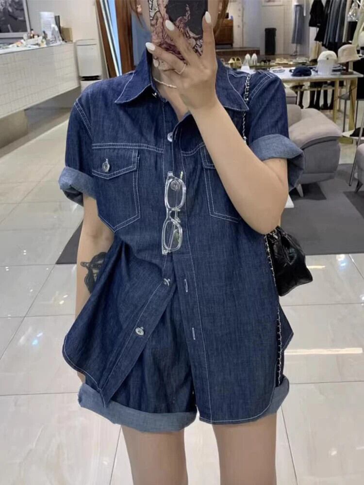 [EWQ] レディース ダブルポケット 半袖 デニムシャツ ウエストロールエッジ ショーツ パンツ 2点セット 2024春夏 6U9169 ショート ハーフスリーブ スプリング 春物 サマー 夏物 ブルマー