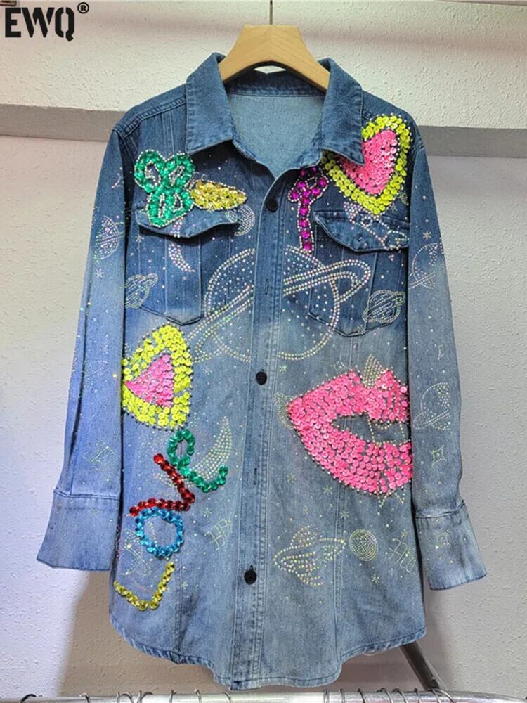 [EWQ] レディース 熱間圧延ダイヤモンド刺繍ビーズ スパンコール レター グラデーション 長袖 デニム シャツ トップス 2024 春秋 16U8754 ロング スプリング 春物 オータム 秋物