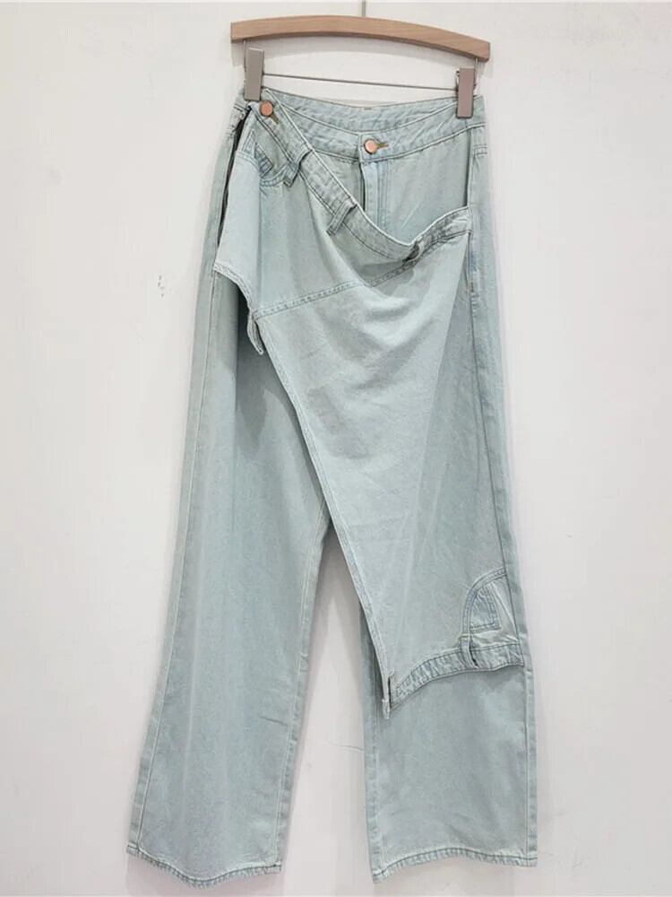 [EWQ] ストリート非対称ブルースプライシングジーンズクールガールストレートレッグパンツデニムパンツ 2024 春夏 16U9581 スプリング 春物 サマー 夏物