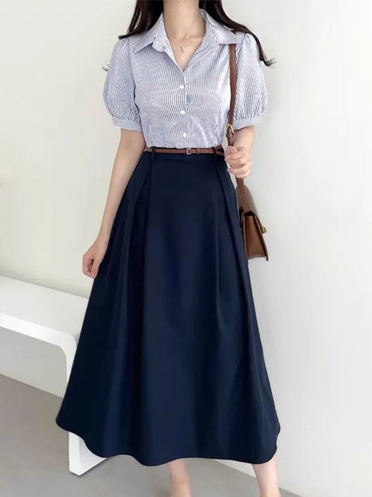 [EWQ] 気質 レディース ラペル フェイク ツーピース パッチワーク 半袖 ストライプ シャツ ロング ドレス ベルト 2024 春夏 16U9260 ショート ハーフスリーブ スプリング 春物 サマー 夏物 ハーネス