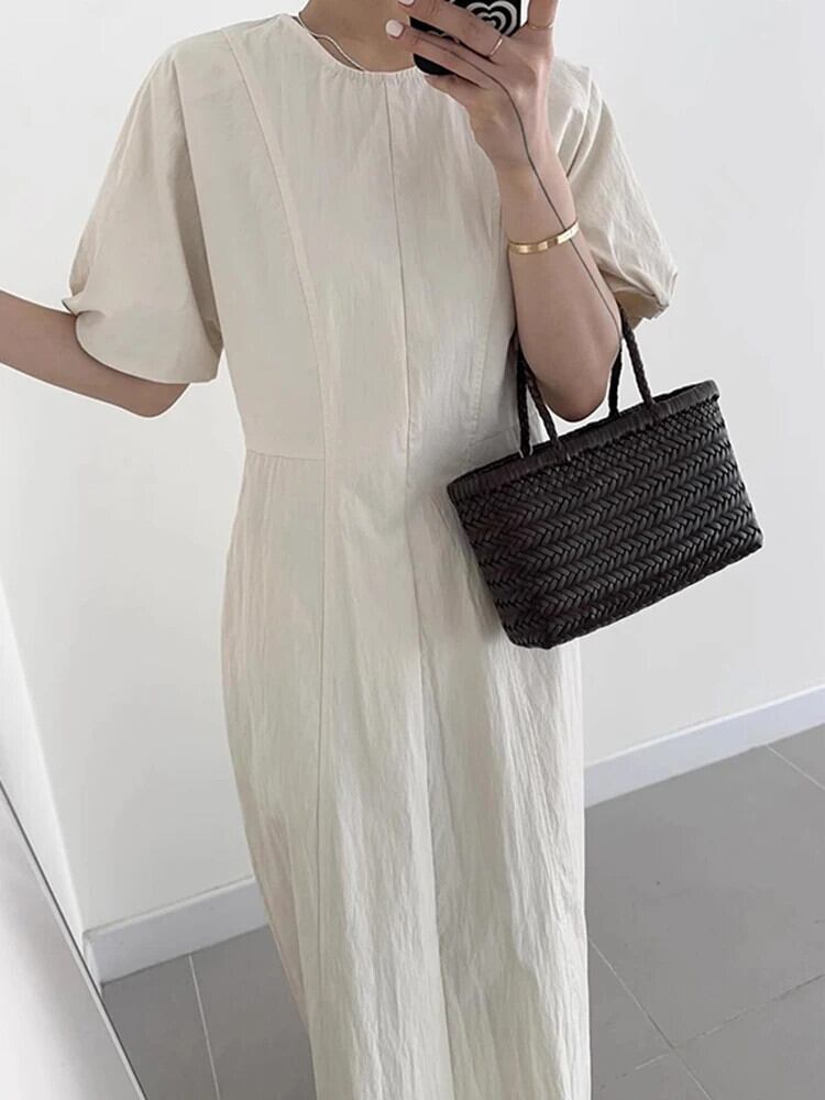 [EWQ] シックラウンドネック無地スプライスウエストスリムバブルスリーブロングドレス 2024 春夏 16U9389 スプリング 春物 サマー 夏物 Oネック ソリッドカラー