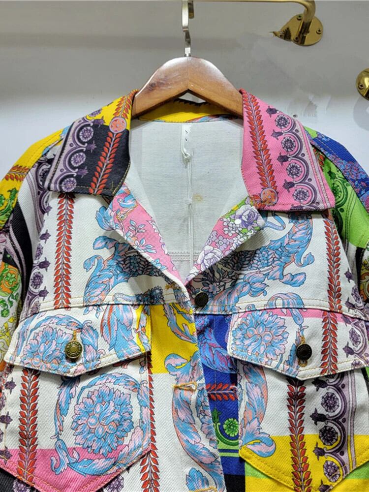 [EWQ] レトロプリントコントラストカラーヨーロピアンデニムジャケットレディースラペルカラーショートコートアウター 2024 春秋 6U8749 スプリング 春物 オータム 秋物