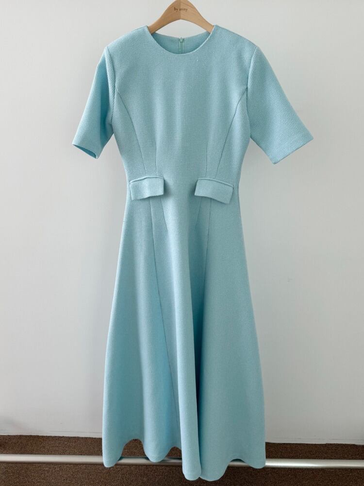 [EWQ] ドレス気質ホワイトライトブルー O ネックフェイクポケット半袖ロングドレス 2024 春夏 U9158 ショート ハーフスリーブ スプリング 春物 サマー 夏物 Oネック