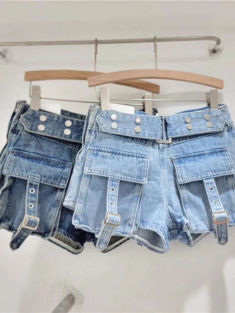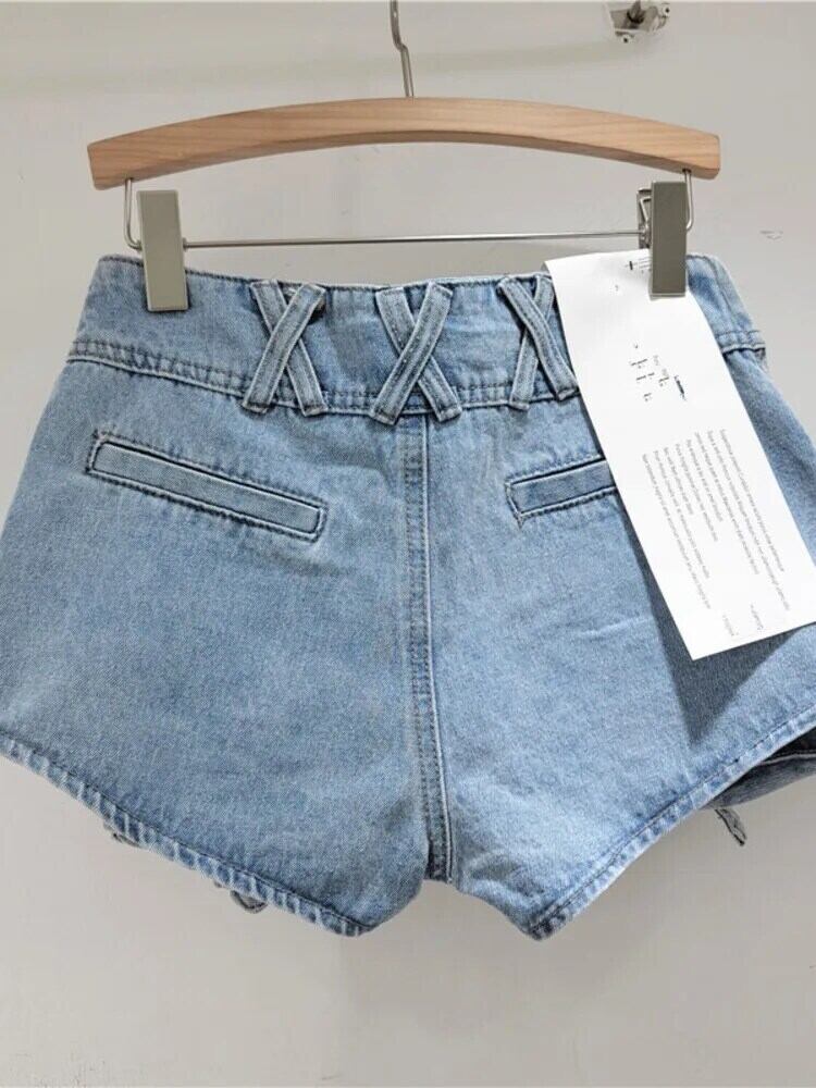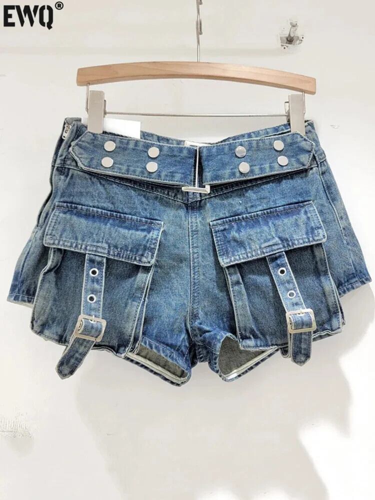 [EWQ] ヨーロピアンエイブル マルチポケット デニムショーツ レディース ワイドレッグ Aライン ブルー ルーズベルトパンツ 2024春夏 16U8747 スプリング 春物 サマー 夏物 ハーネス ブルマー ワイドパンツ ポケット多め