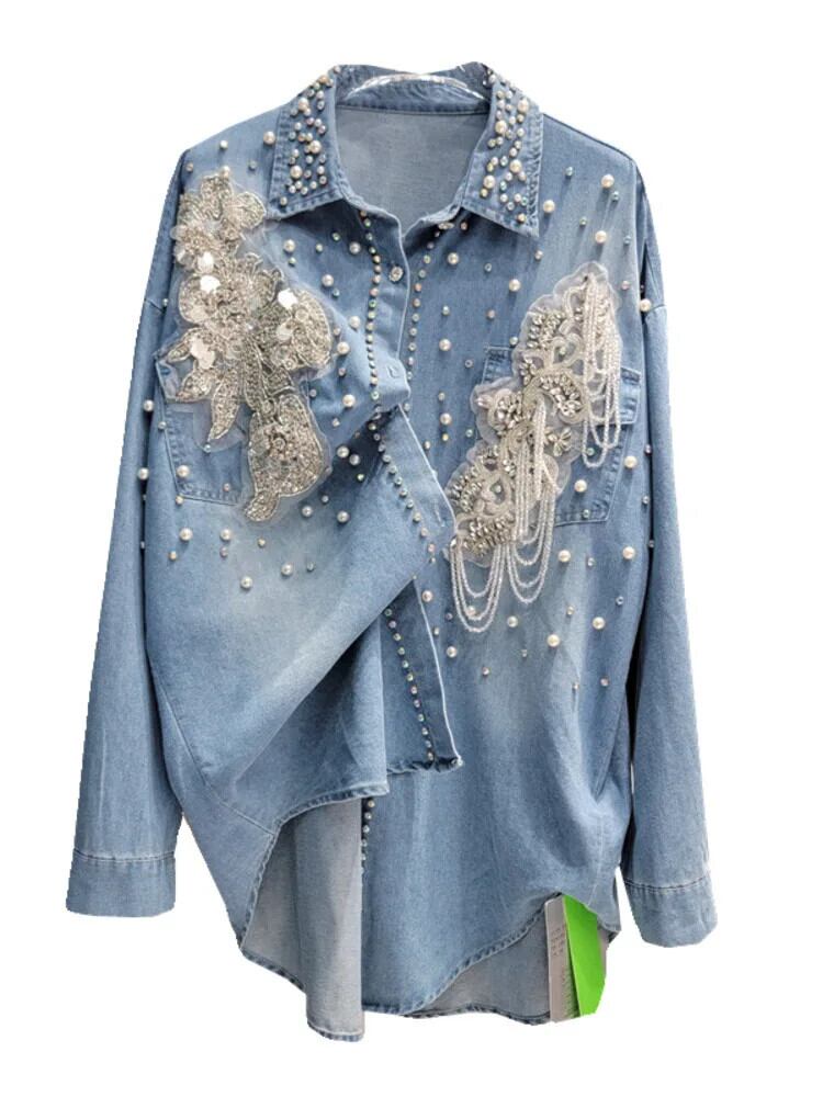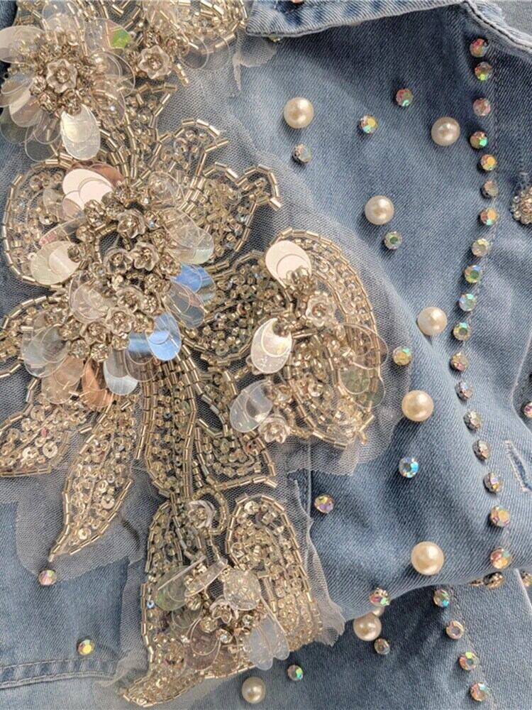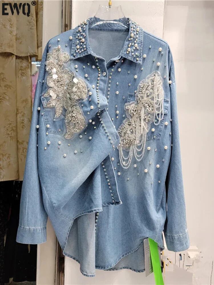 [EWQ] ヨーロピアンフラワーデニムシャツ レディース ラペルカラー シングルブレスト ビーズカーディガン ブラウス トップス 2024春夏 16U9009 スプリング 春物 サマー 夏物 フラワーデザイン