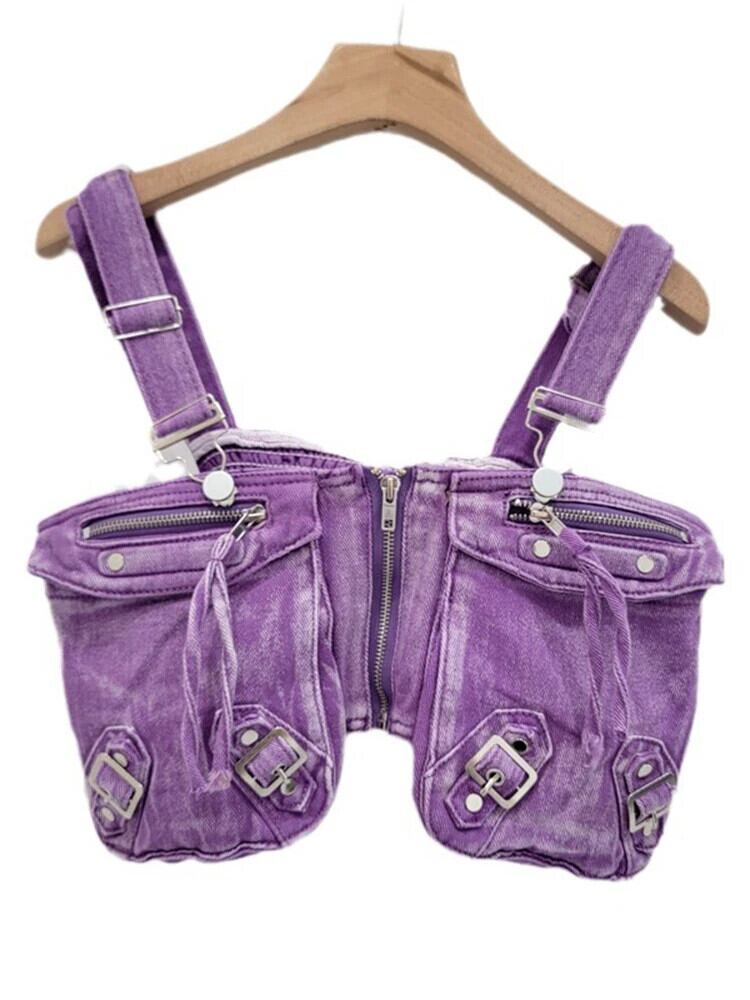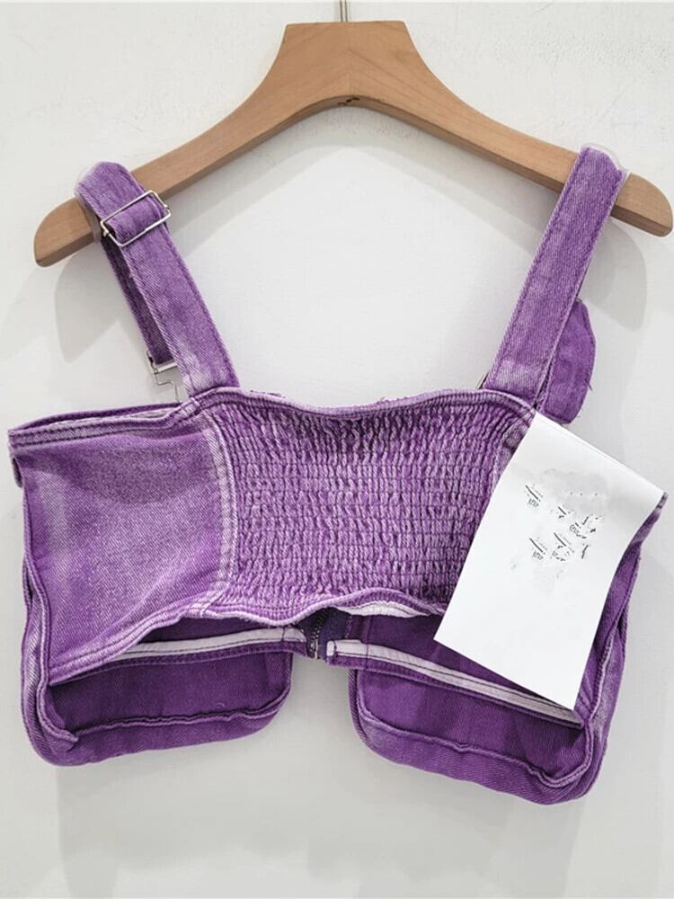 [EWQ] 有能 Y2k ポケット デニム ストラップレス キャミソール トップス ノースリーブ パープル ジッパー バックル タンク スリング トップ 2024 夏 16U9800 サマー 夏物