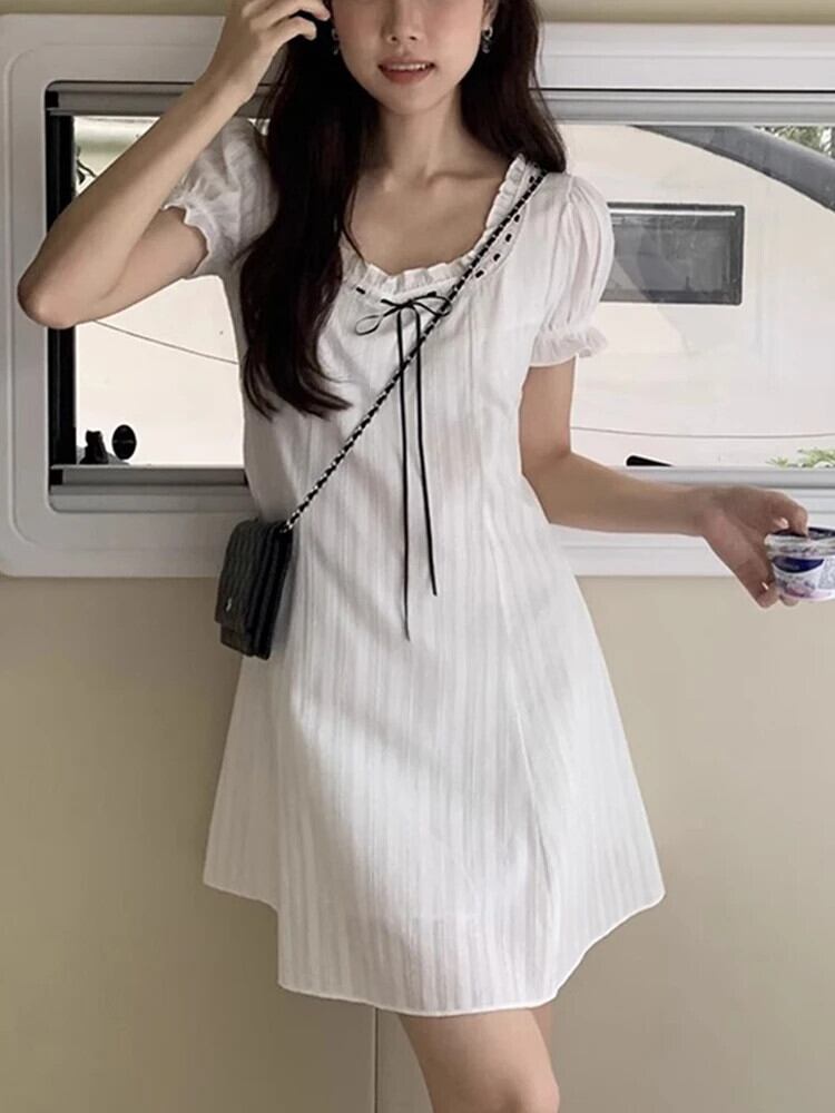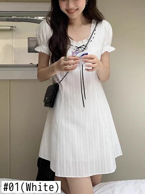 [EWQ] ホワイトスクエアネックレースアップコントラストカラーウエストスリムバブルスリーブミニドレス 2024 春夏 16U9151 スプリング 春物 サマー 夏物 スクウェア
