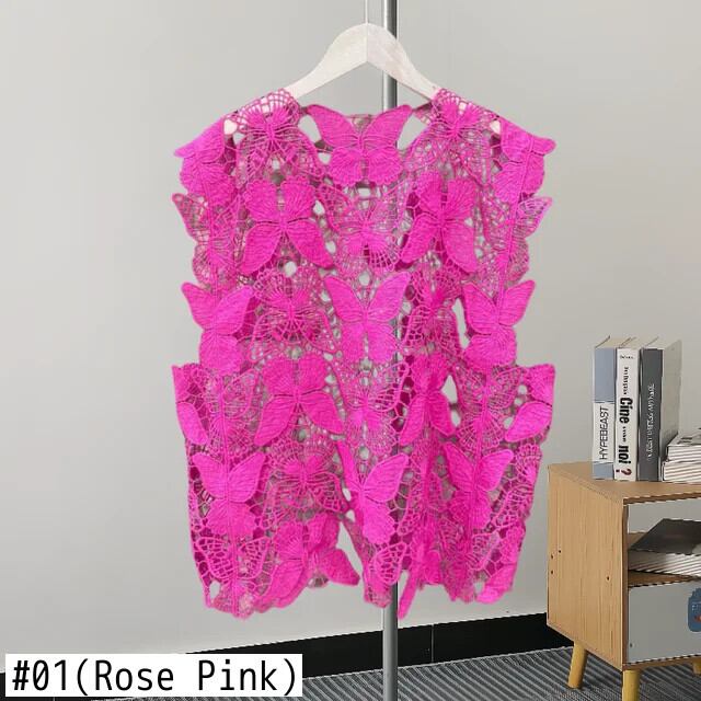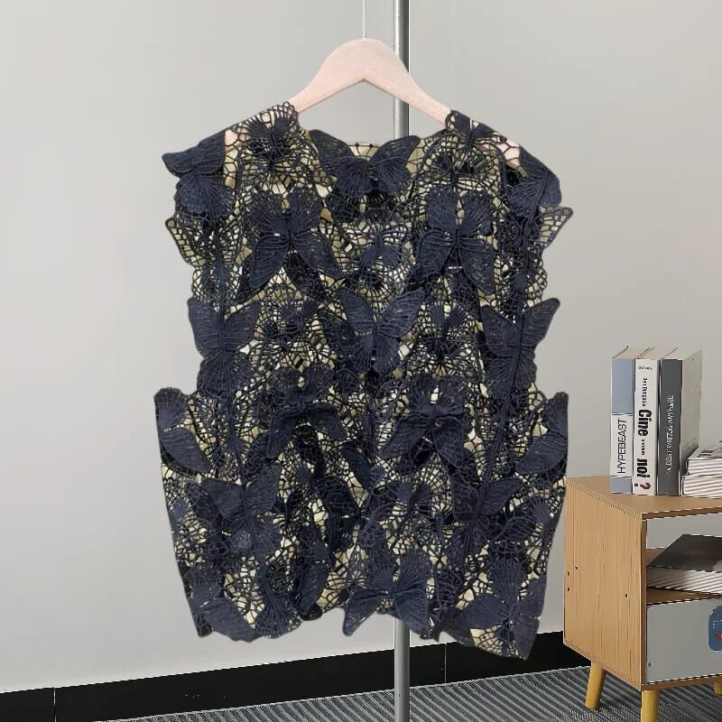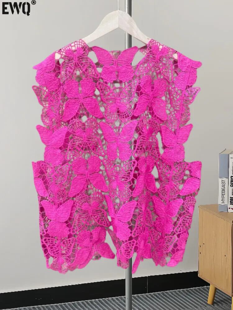 [EWQ] スイートフックフラワーくり抜きブラウス O ネックノースリーブ立体蝶シャツ 2024 夏 GZ72 大人ガーリー スウィート キュート カジュアル サマー 夏物 Oネック フラワーデザイン