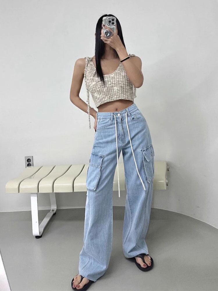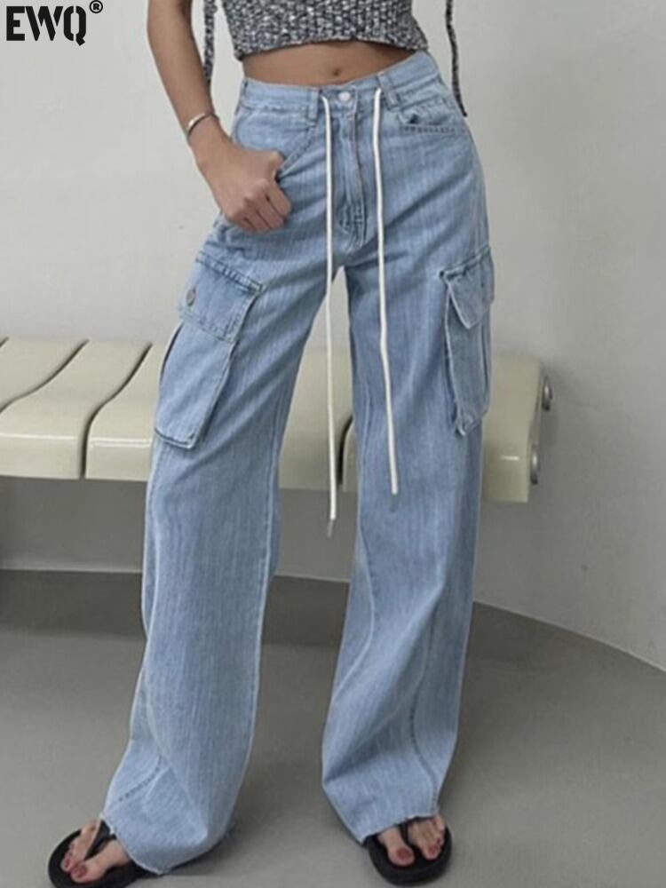 [EWQ] スタイルウエストポケットレースアップワイドレッグウォッシュデニムパンツレディース 2024 秋 GZ332 オータム 秋物 ワイドパンツ