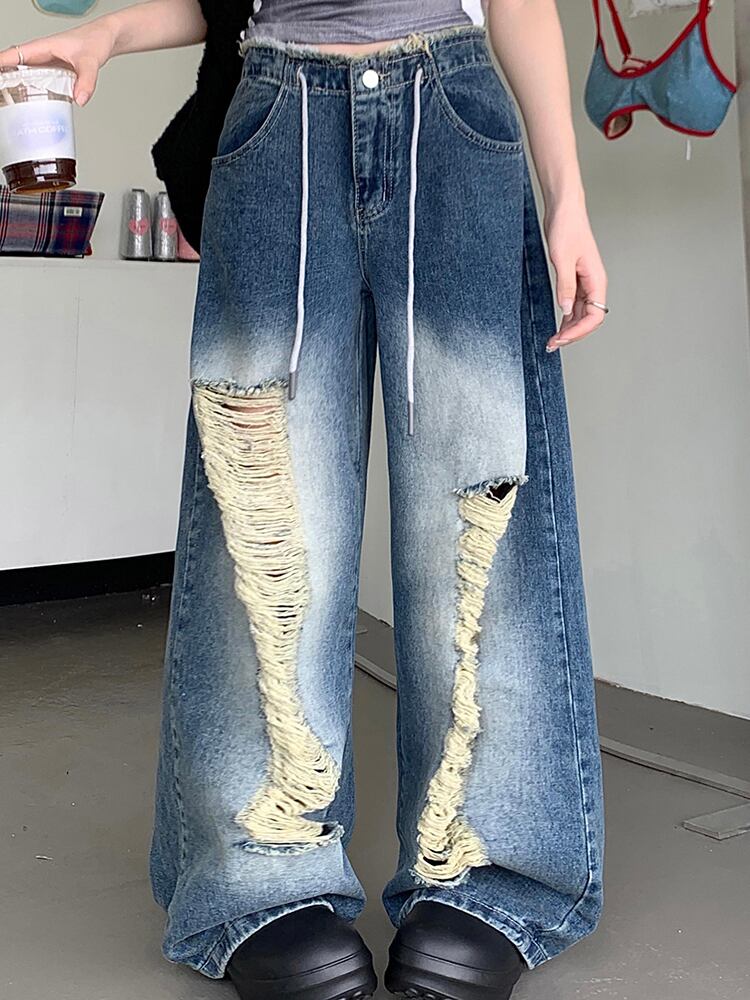[EWQ] 穴ジーンズルーズワイドレッグパンツブルーストリートストレートパンツ 2024 夏 16O691 サマー 夏物 ワイドパンツ