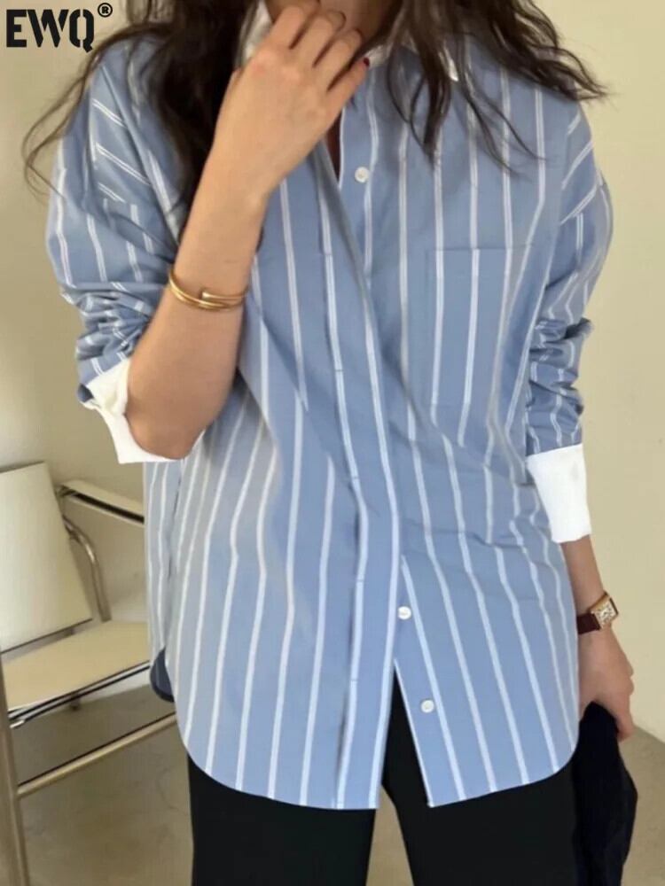 [Ewq] koreanische lässige Stil gestreifte Blusen Kontrast farben los Hemden schöne Damen bekleidung Herbst neu gz528