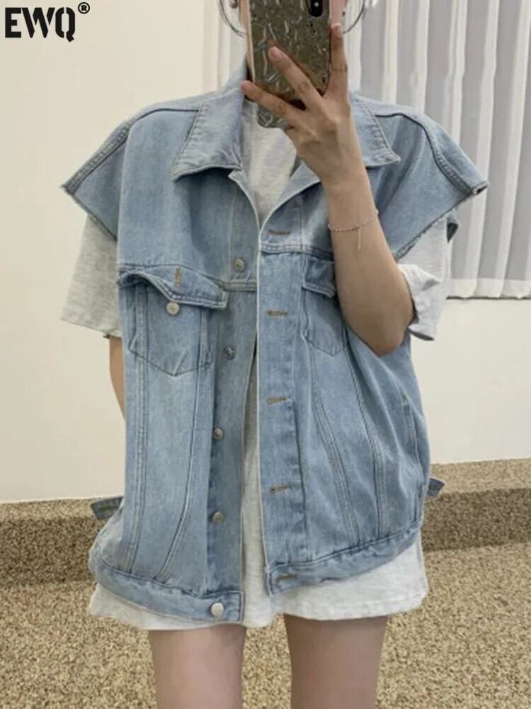 [Ewq] ジーンズ Weste Frauen ärmelose einreihige Tasche Kleidung Mode トップス Herbst jacke 2024 Sommer mäntel 16 o102