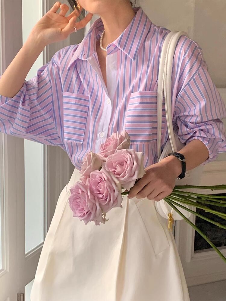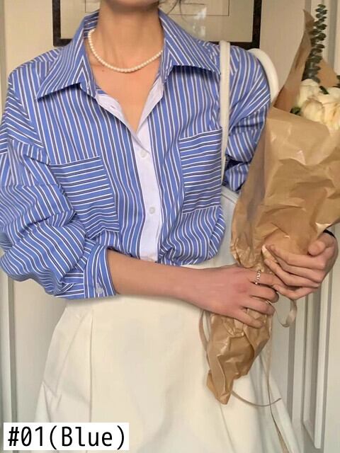 [Ewq] Full Mouw Contrasterende Kleuren Gestreepte ブラウス Zakken Ontwerp Losse シャツ オフィスレディ トップス 2024 Herfst Nieuwe Stijl 16o1117 会社 学校 通勤や通学にも