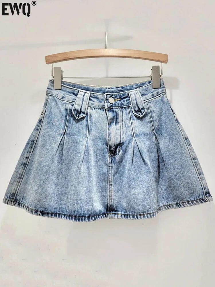 [Ewq] ストリート Zwarte デニム Korte Rok Dames Europese Stijl Mode Veelzijdige Geplooide A-Line Rokken 2024 Zomer Nieuw Aライン