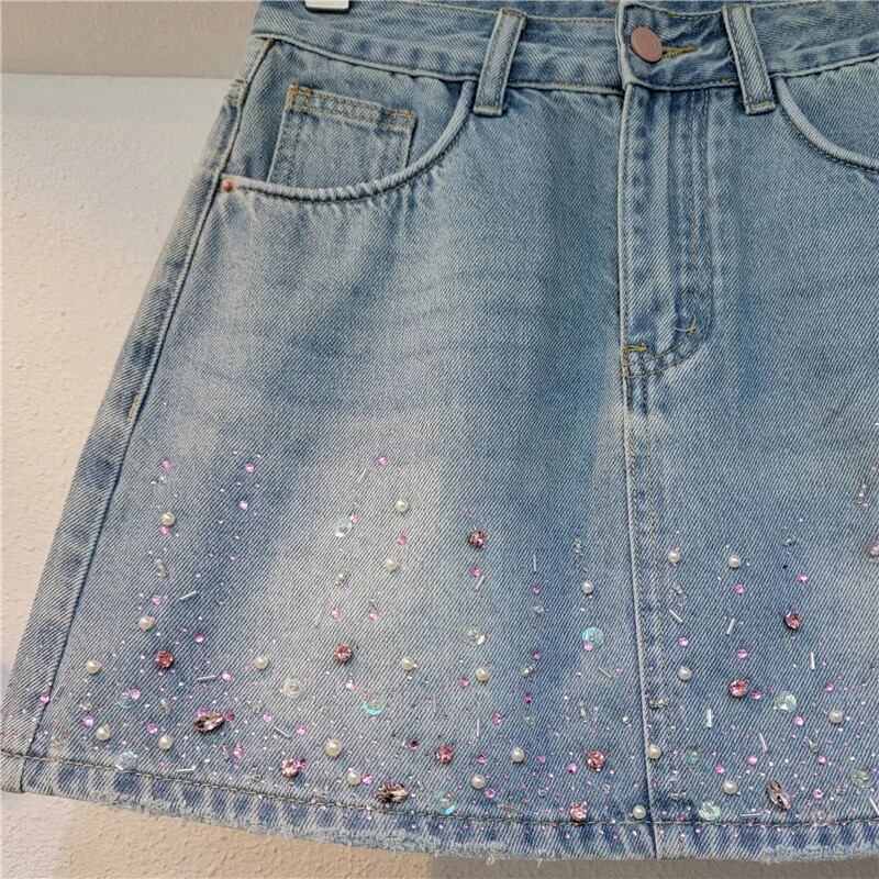 [Ewq] lässige Frauen Kleidung Perle heißen Diamant hoch taillierten デニム クルゼン ロック 2024 Sommer gewickelt Hüfte Miniröcke weiblich 16 o671