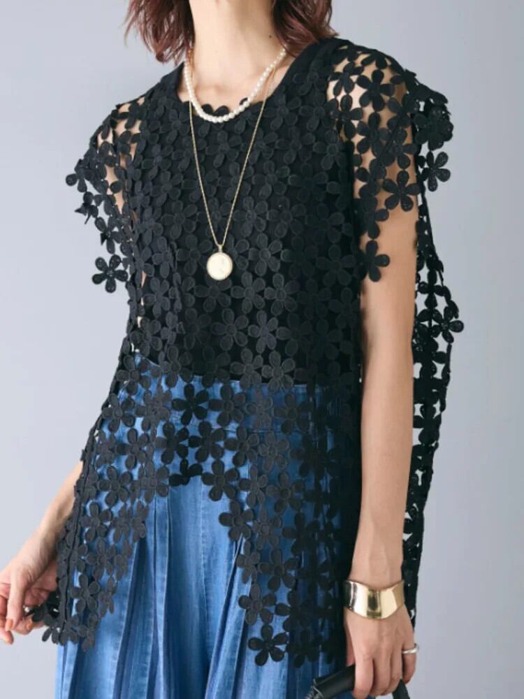 [Ewq] bestickte Blume ausgehöhlt Tシャツ für Frauen Mode Solide Kurzarm weibliche Kleidung 2024 Sommer neu 16 o668 ソリッドカラー