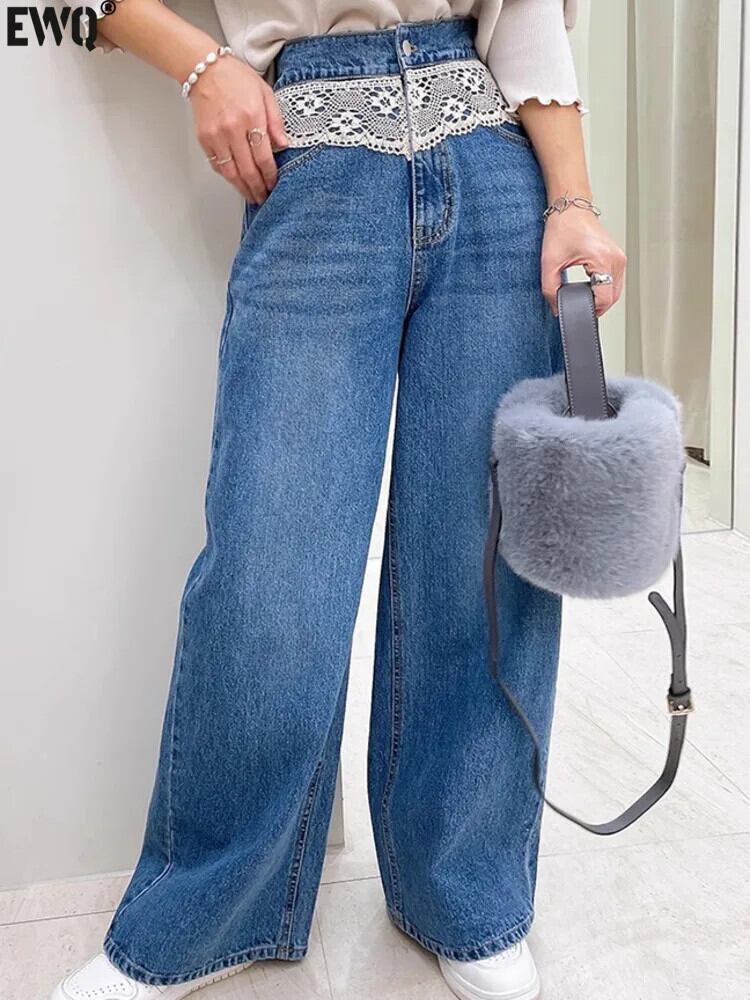 [Ewq] hohe Taille gespleißte Spitze aushöhlen ジーンズ hose gerade Hose lässige Damen bekleidung 2024 Herbst neu 16 o1130
