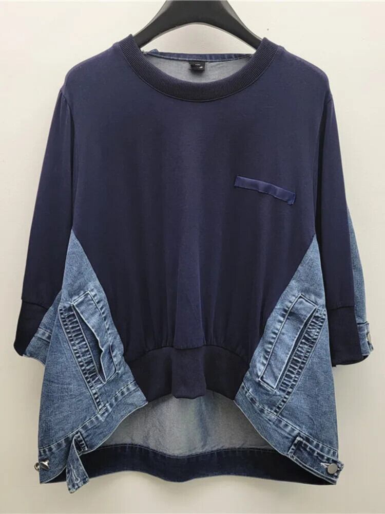[Ewq] ストリート Stijl デニム Stiksel Wit スウェットシャツ Onregelmatige Zoom Losse トップス O-Hals Kleding 2024 Herfst 16o12