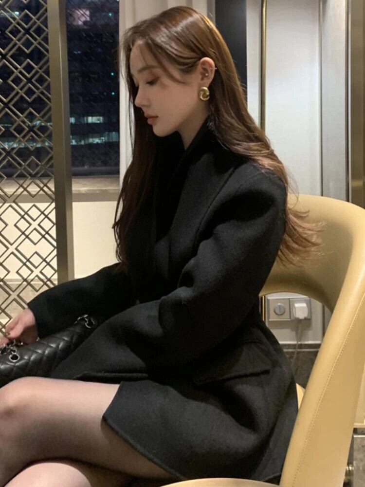 [Ewq] 韓国シュヴァルツ ベージュ V-Ausschnitt Schnürung Taille schlanke vielseitige Langarm Woll mantel Jacken für Frauen 2024 Herbst Winter 6 u6540 ウィンター 冬物