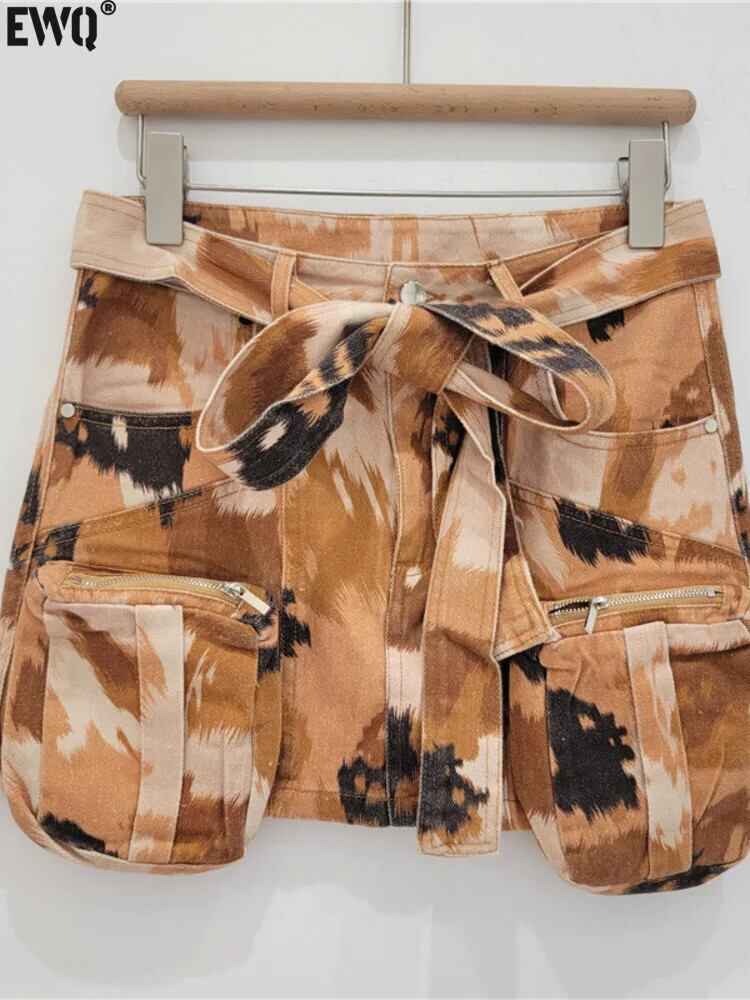 [Ewq] hoher Taille bedruckter kurzer Rock mit Gürtel 3d doppelte Taschen Röcke schöne Damen bekleidung 2024 Sommer neu gz422