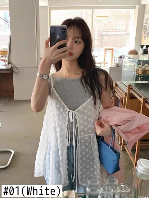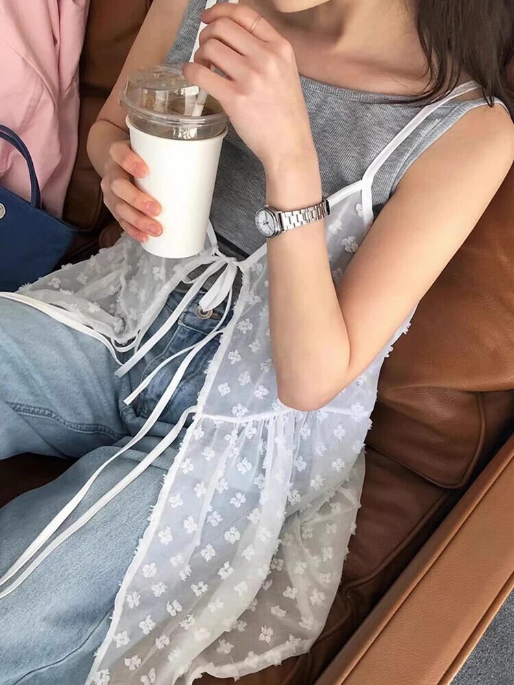 [Ewq] V-Ausschnitt bestickt Jacquard Schnür Tanks für Frauen Perspective geschichteten Mesh Hosenträger 2024 Sommer neu 16 o631 メッシュ