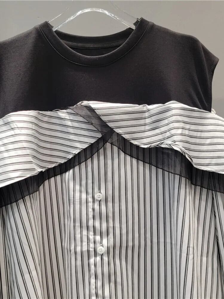 MooQ-Chemisier à Manches sulfet Col Rond pour 、Haut à Rayures Verticales、Fauses 2 Pieces、Nouvelle Collection Automne 2024、16O1224