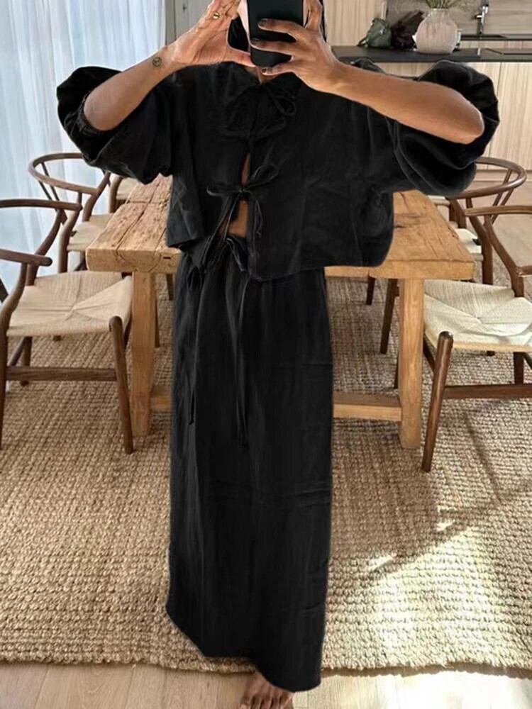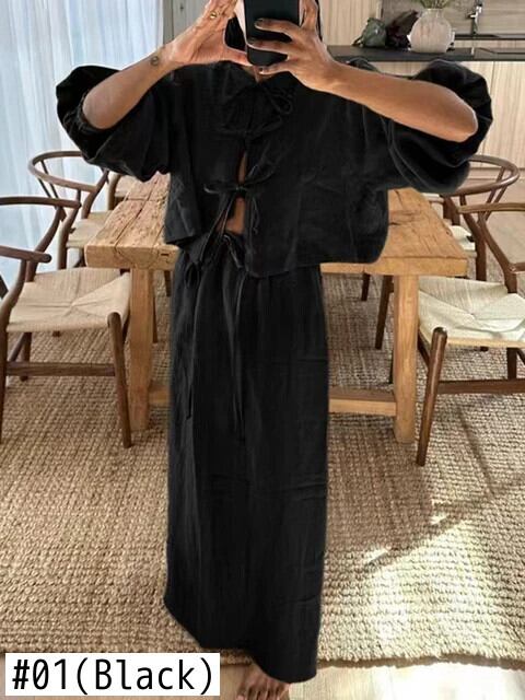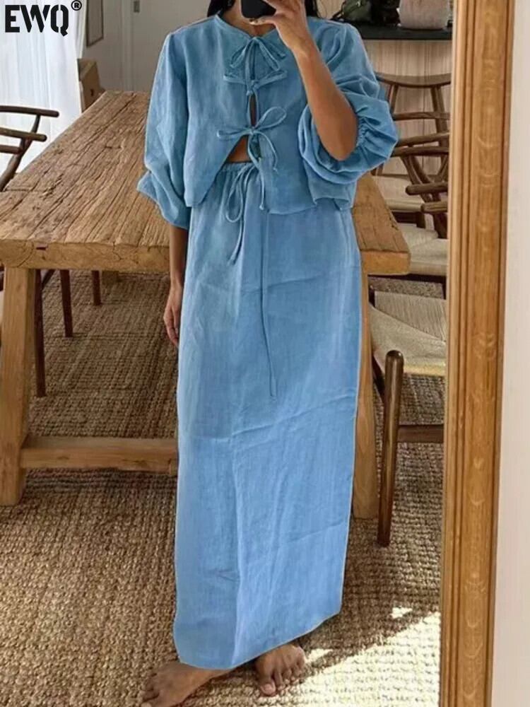 [Ewq] 2 デリージュ セット Kleding Voor Vrouwen Solide Veters Top Losse Elastische Rok Mode Dameskleding 2024 Zomer Nieuwe 16o903 ソリッドカラー