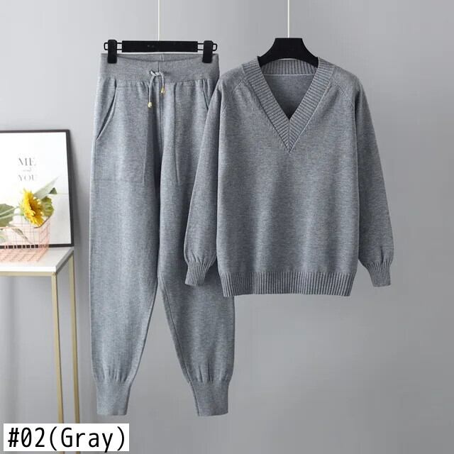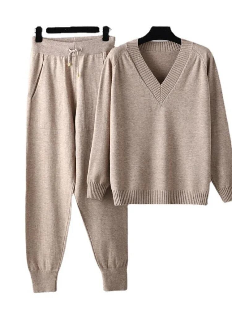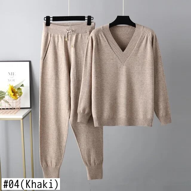 [Ewq] Minimalistische Lange Mouw V-Hals Losse Trui Tops Hoge Taille Met Trekkoord Harembroek 2-delige Set Winter 2024 Herfst ウィンター 冬物