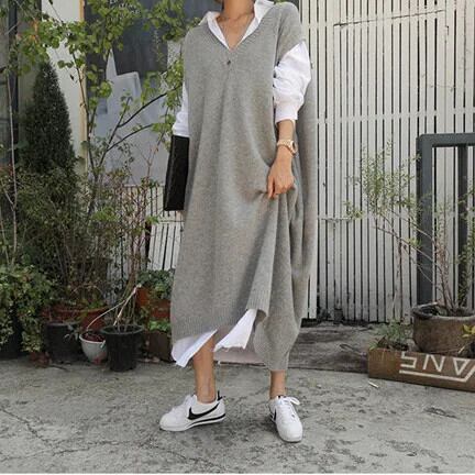 [EWQ] ベーシック Stijl V-hals Lange Gebreide n Losse Grote Maat Trui Vest Dameskleding 2024 Herfst Nieuwe GZ406