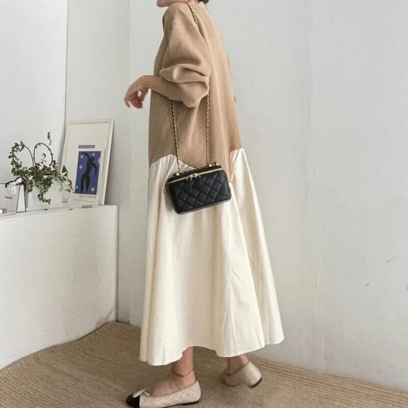 [Ewq] ランガルム V-アウスシュニット ストリック パッチワーク Kontrast farben ロッカー Kleid einreihig lässig Frauen kleider Herbst neu 16 o1943